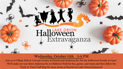 The 2025 Halloween Extravaganza welcomes you to Downtown Lake Orion for a fun, family-friendly Fall event! Join us Wednesday, Oct. 15, from 5- 8 pm.